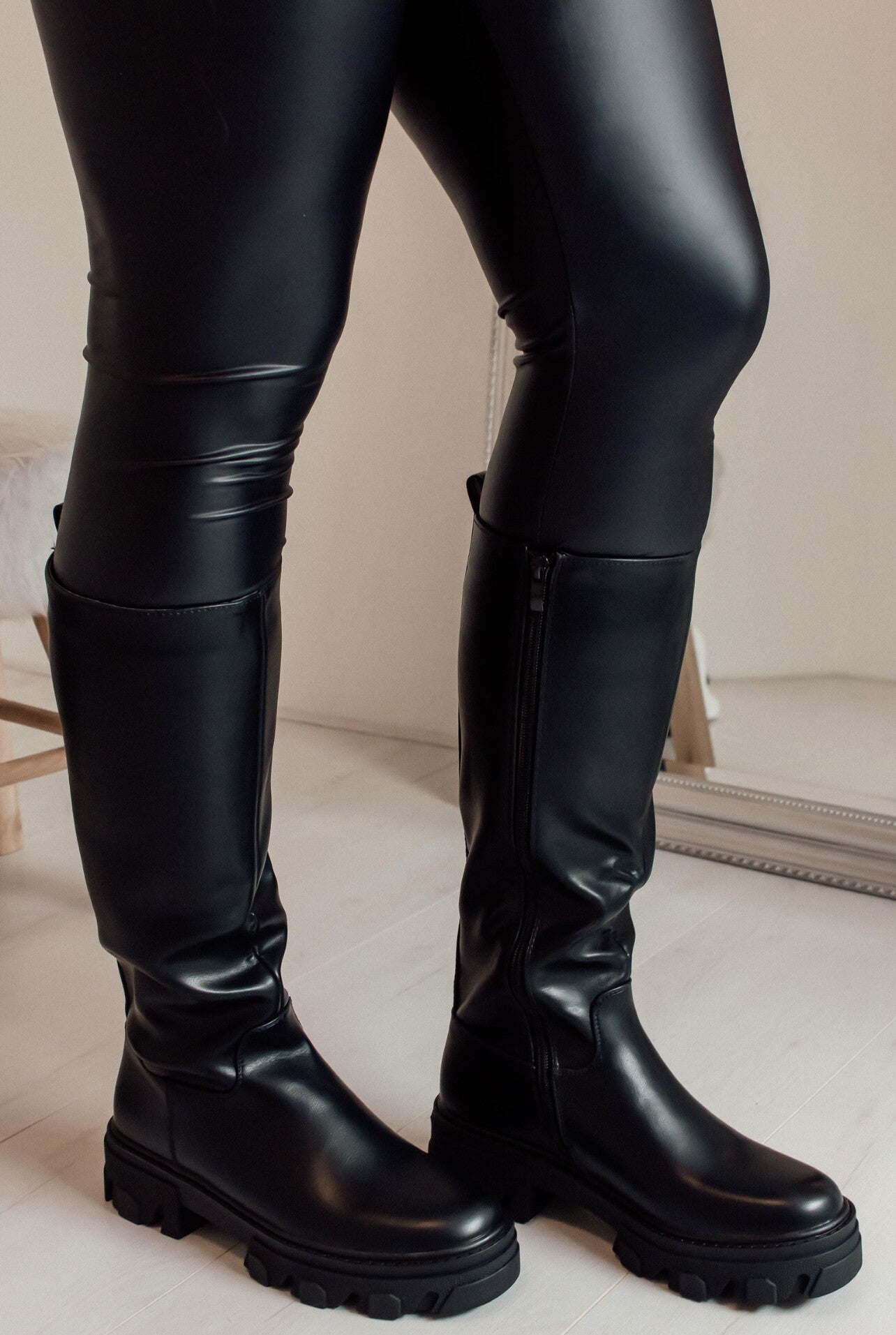 Lange laars met rits aan de binnenzijde. Hoge zool. Neem een maat kleiner, bij dikke kuiten of brede voeten neem je eigen maat.