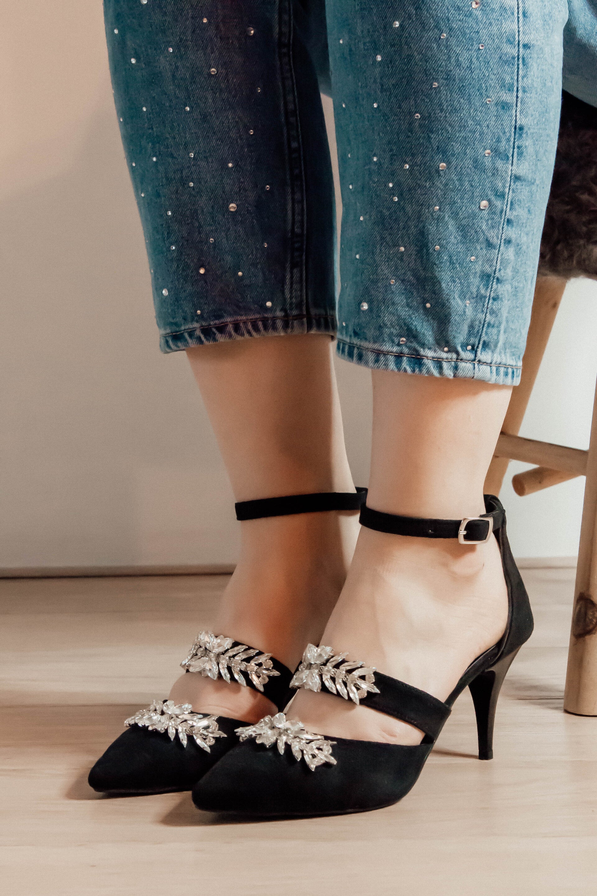 Heels with a low heel, ideal for ladies who are a bit taller or ladies who don't like to walk in high heels. It has a rhinestone detail on the front and a strap around the ankle. Take your own size.
