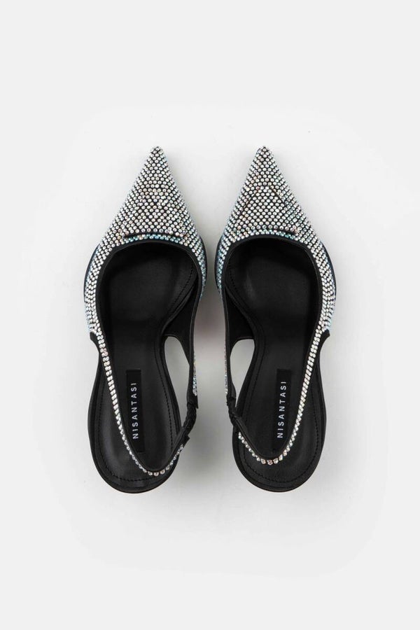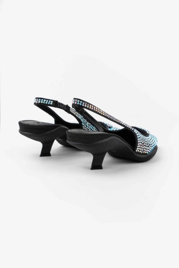 Black pumps with silver stones. Heel height is 4 cm. Size advice: take your own size, with half sizes take the largest size.